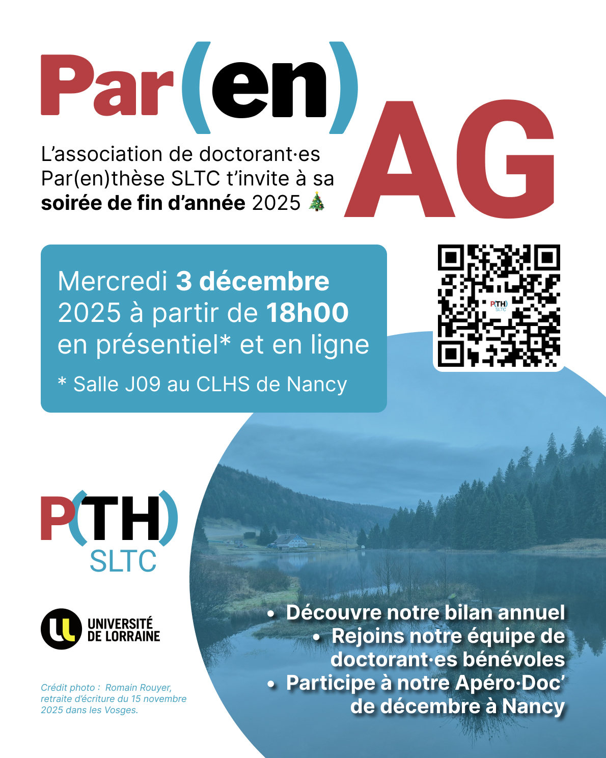 Le bureau de l’association Par(en)thèse SLTC a le plaisir de te convier à sa traditionnelle soirée de fin d’année le mercredi 3 décembre 2025 à partir de 18h00.